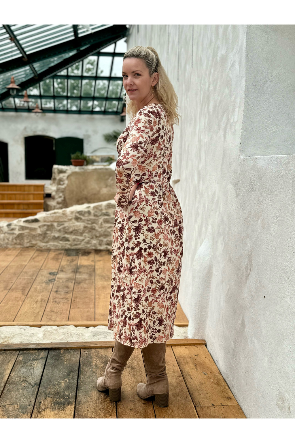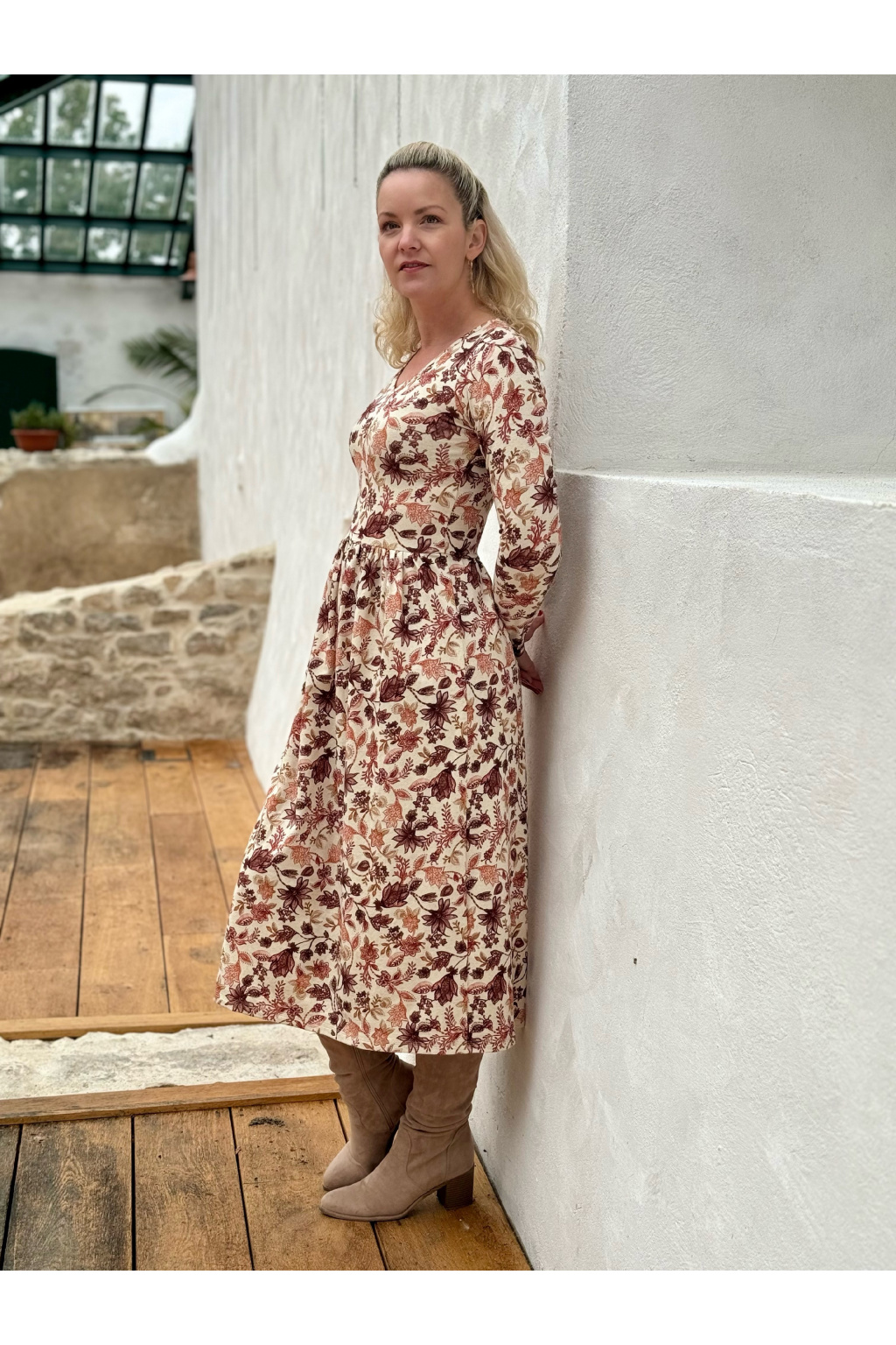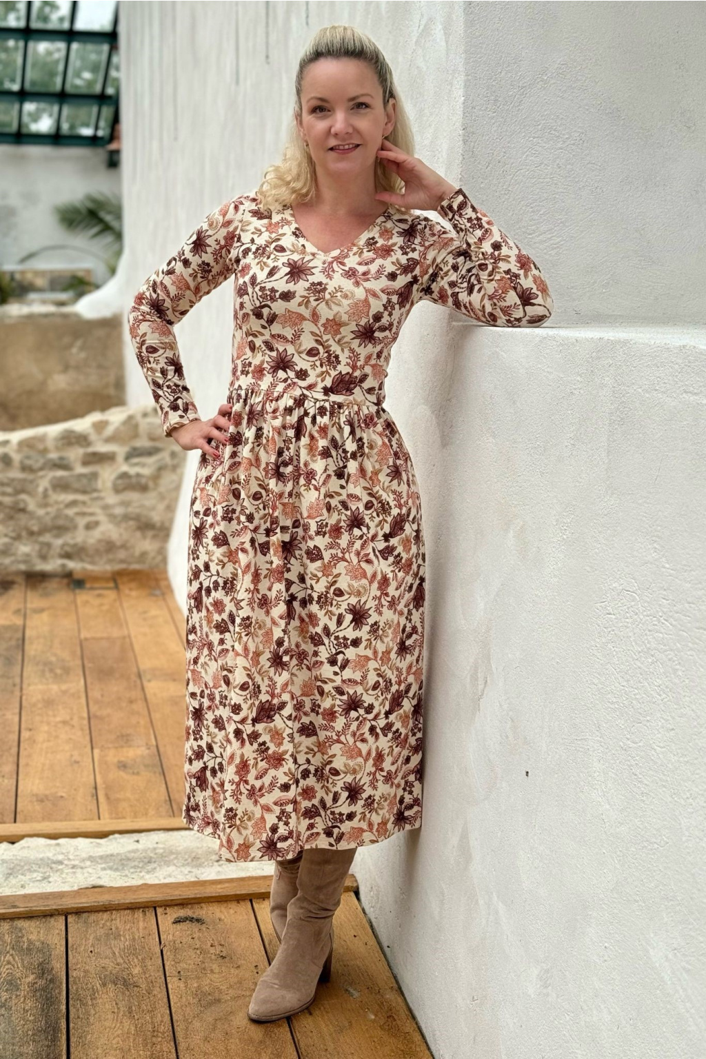 Modelka na fotce má na sobě: šaty vel. XS, midi s délkou 120 cm, řasenou sukni, véčkový výstřih, dlouhý rukáv.