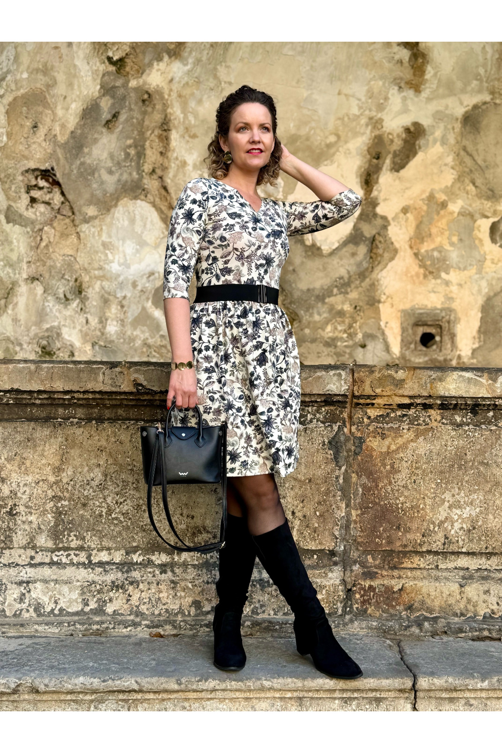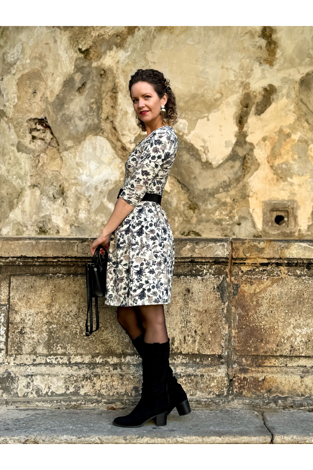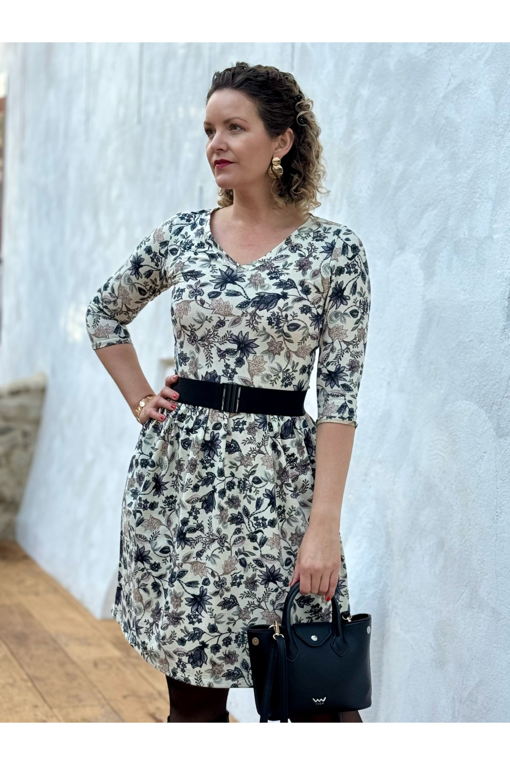 Modelka na fotce má na sobě: šaty vel. XS, krátké s délkou 95 cm, řasenou sukni, véčkový výstřih, 3/4 rukáv, je vysoká 171 cm.