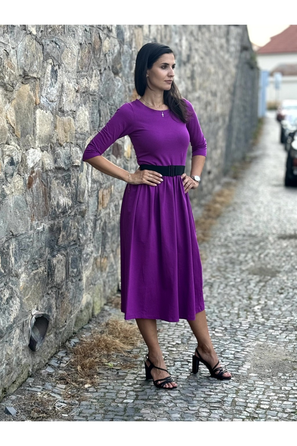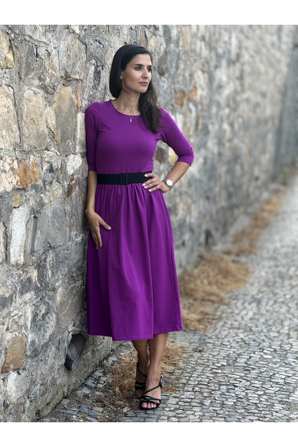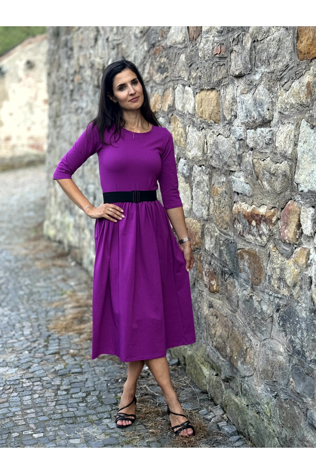 Modelka na fotce má na sobě: šaty vel. S, midi s délkou 115 cm, řasenou sukni, kulatý výstřih a 3/4 rukáv, je vysoká 170 cm.