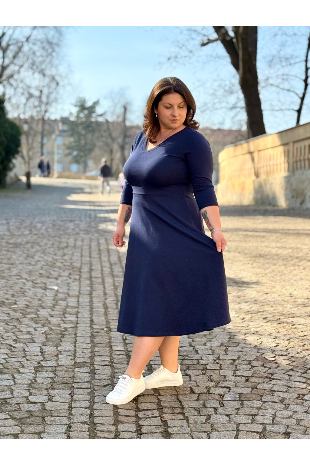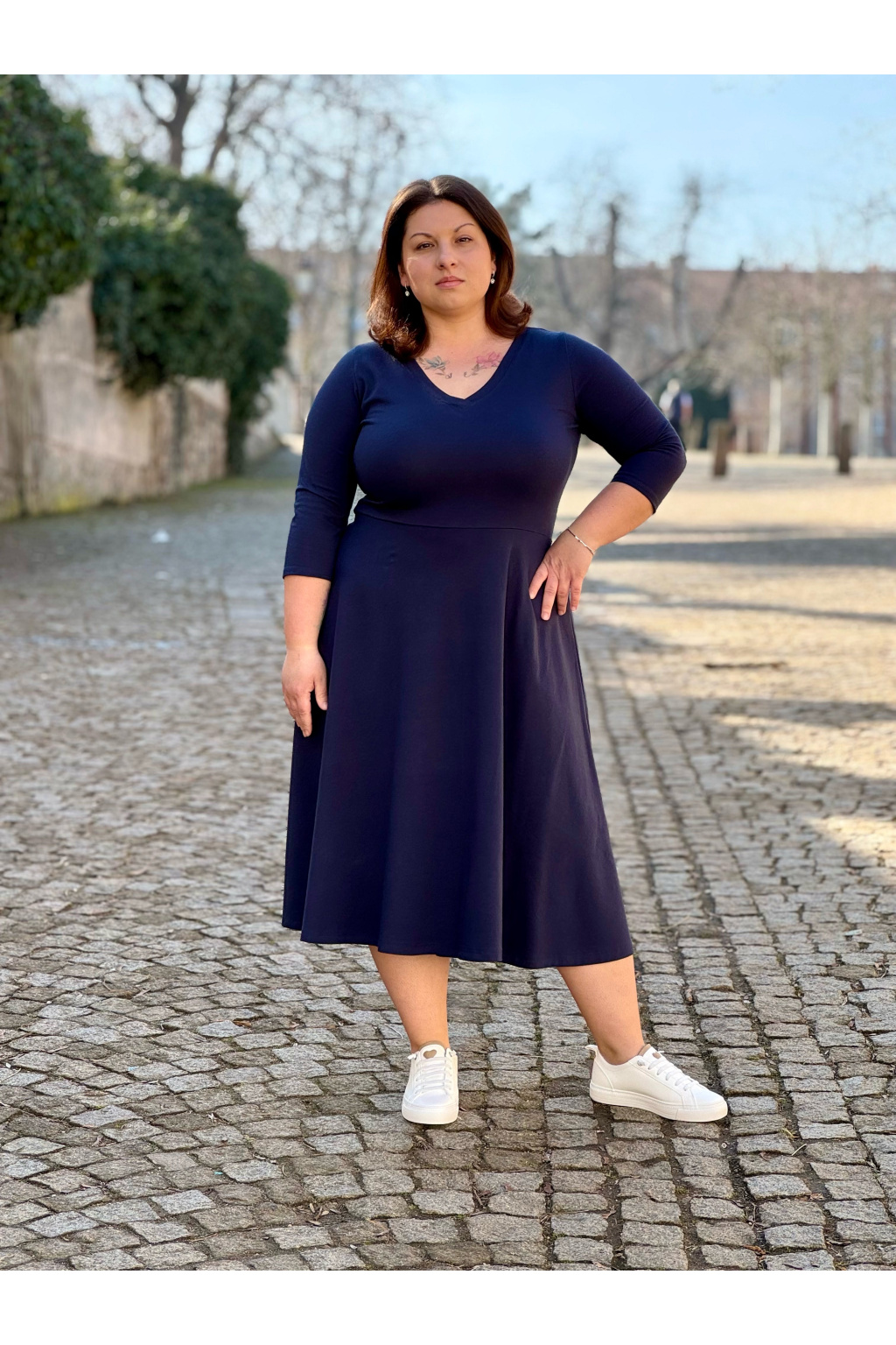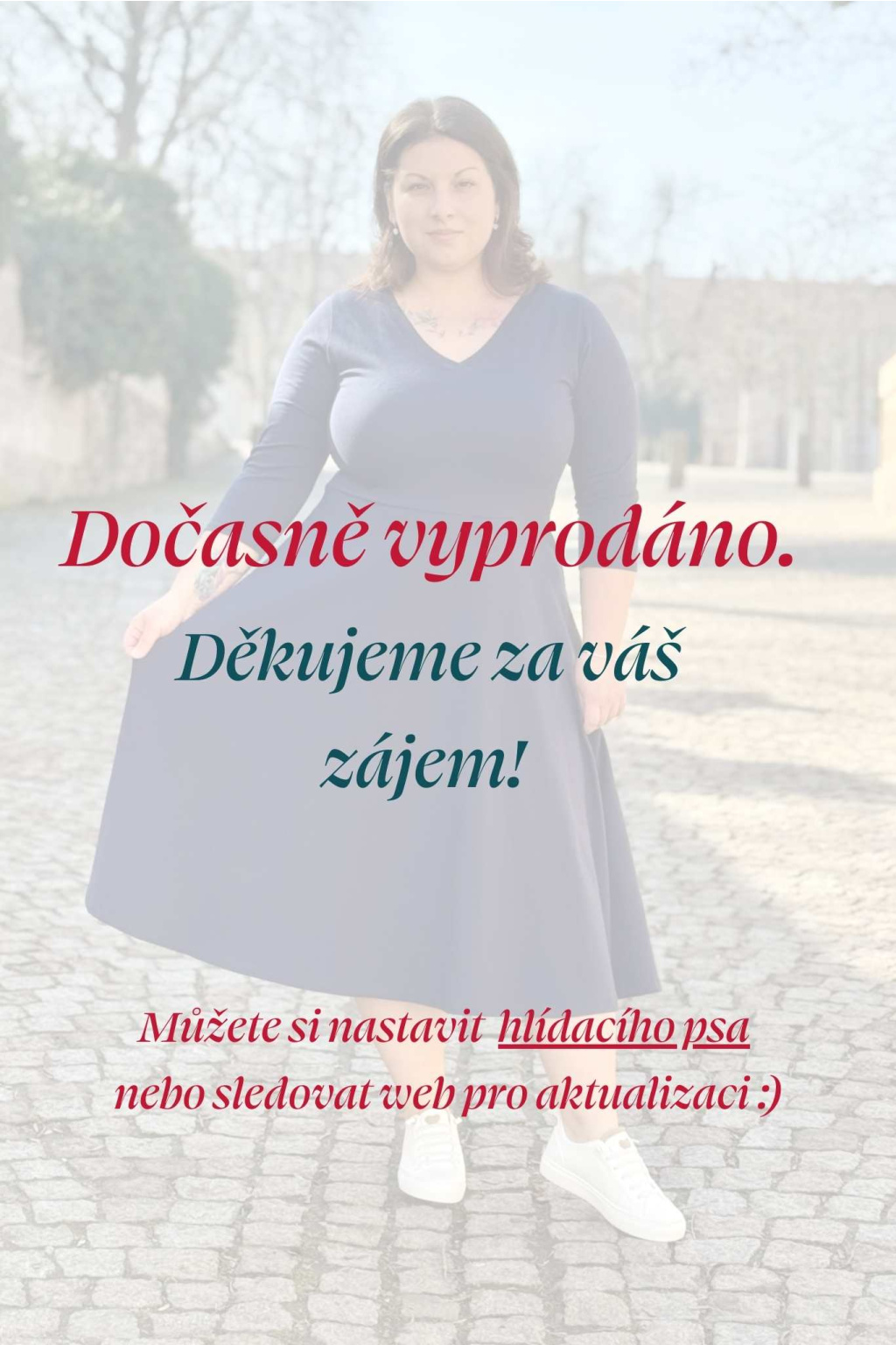 Modelka na fotce má na sobě: šaty vel. XL, midi s délkou 115 cm, půlkolovou sukni, véčkový výstřih, 3/4 rukáv, modelka je vysoká 160 cm.
