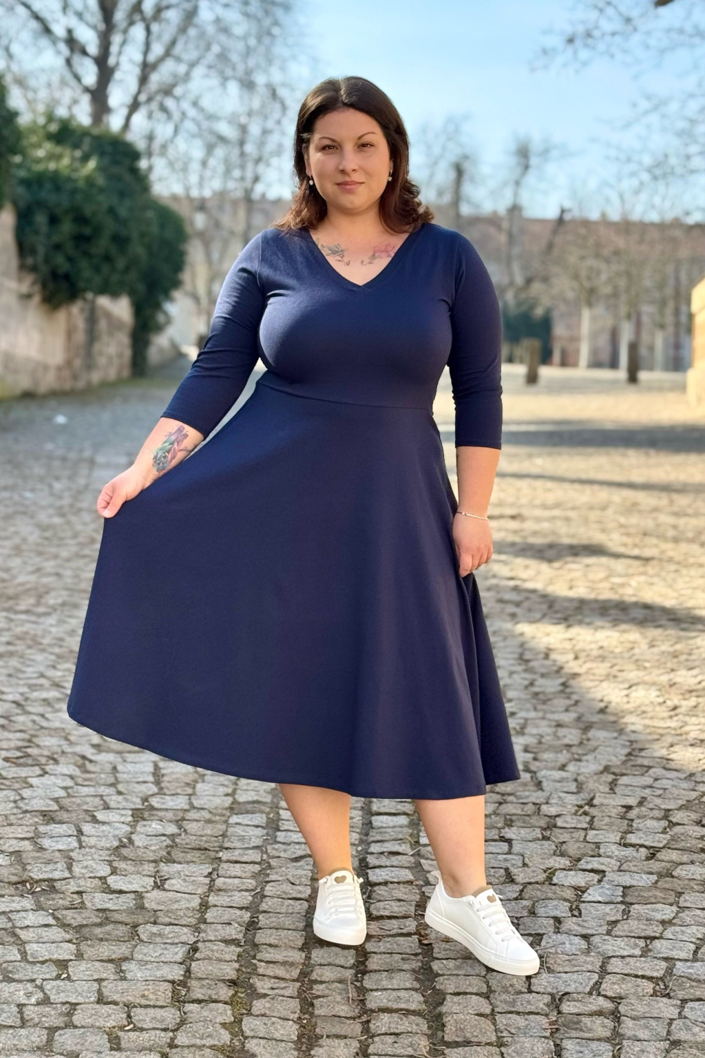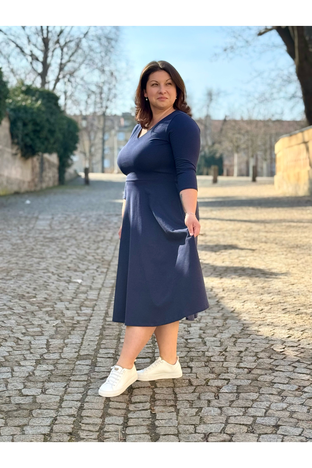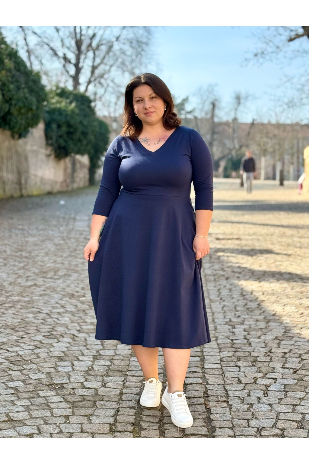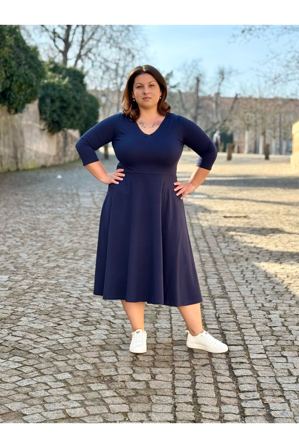 Modelka na fotce má na sobě: šaty vel. XL, midi s délkou 115 cm, půlkolovou sukni, véčkový výstřih, 3/4 rukáv, modelka je vysoká 160 cm.
