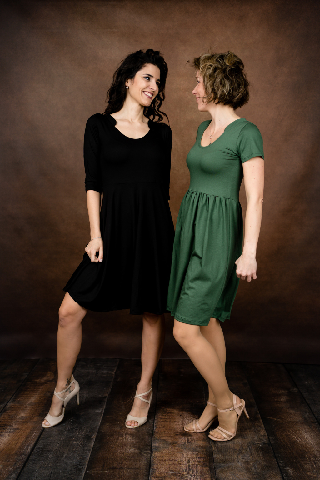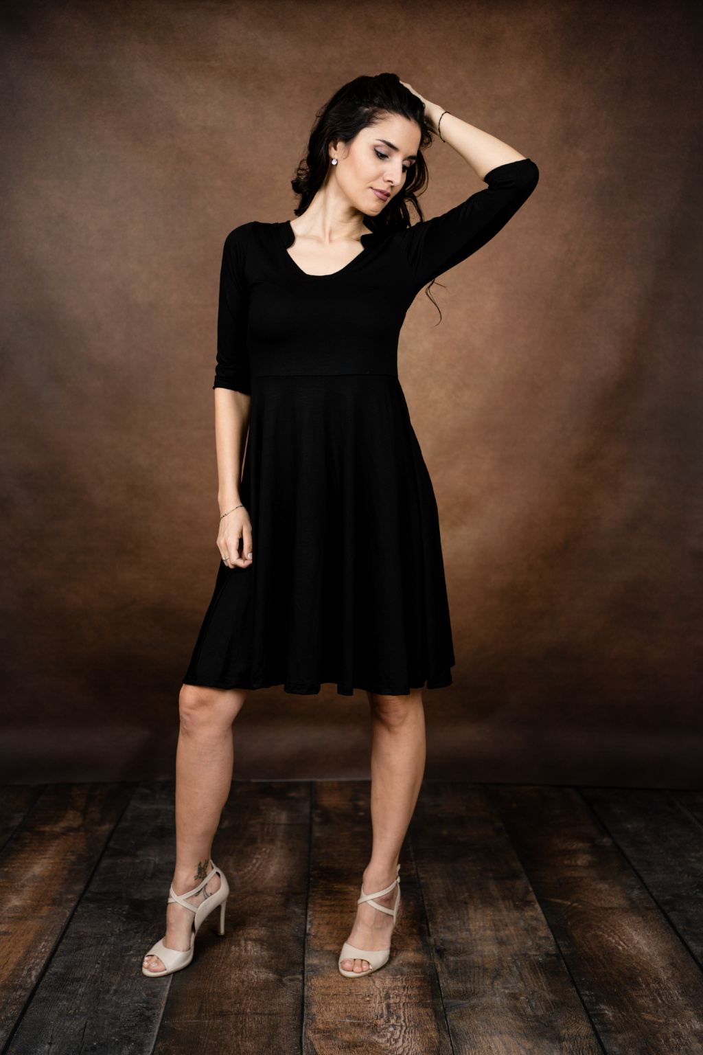 Modelka na fotce má na sobě: šaty ve velikosti XS, krátké s délkou 95 cm, půlkolovou sukni, 3/4 rukáv, je vysoká 170 cm.