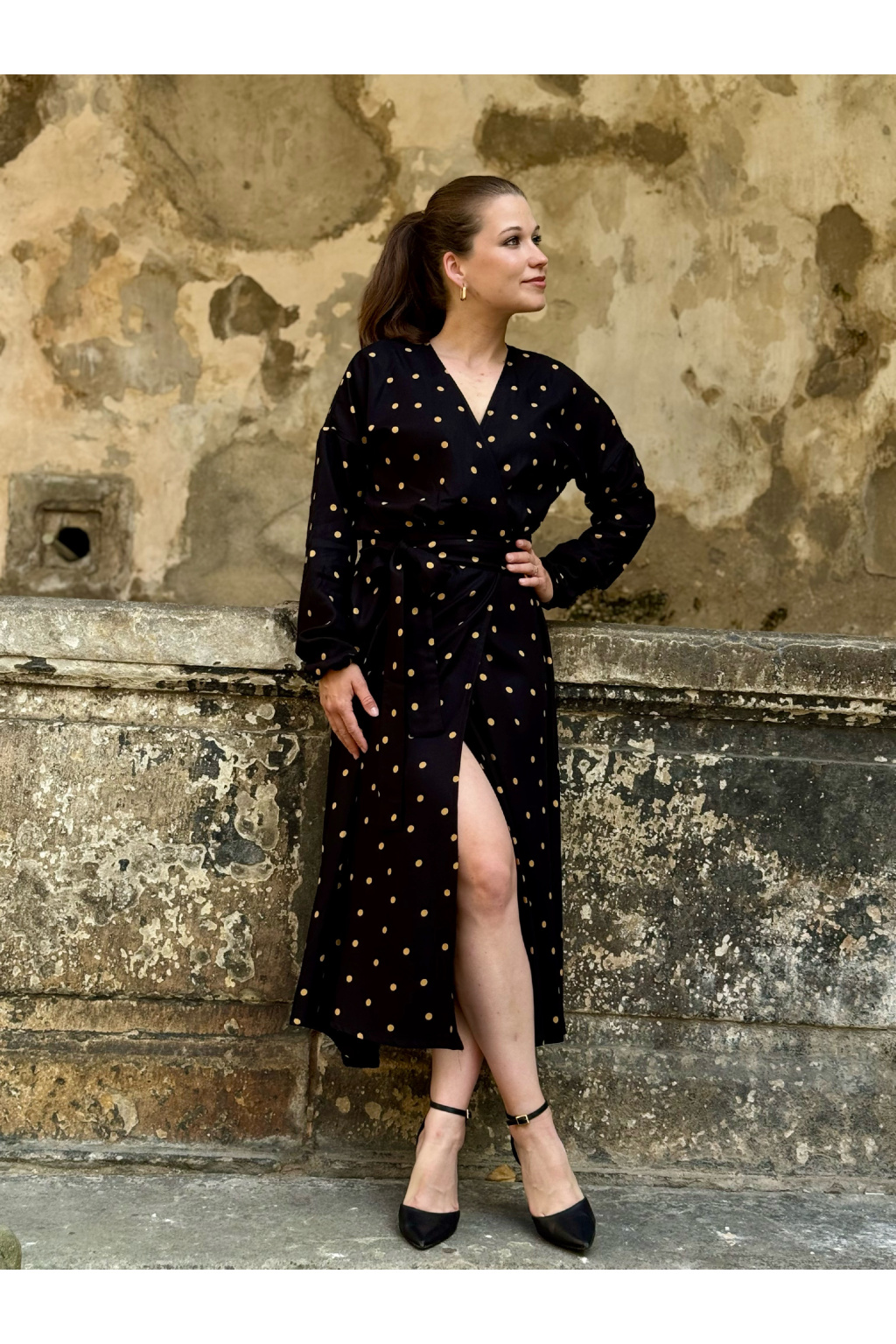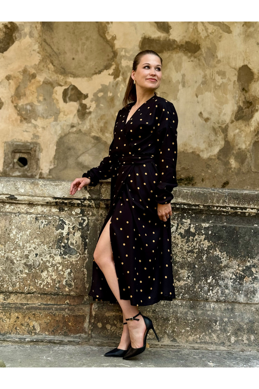 Zavinovací šaty - puntíkaté - černá - EcoVero viskóza - midi - vel. S - 120 cm - skladem