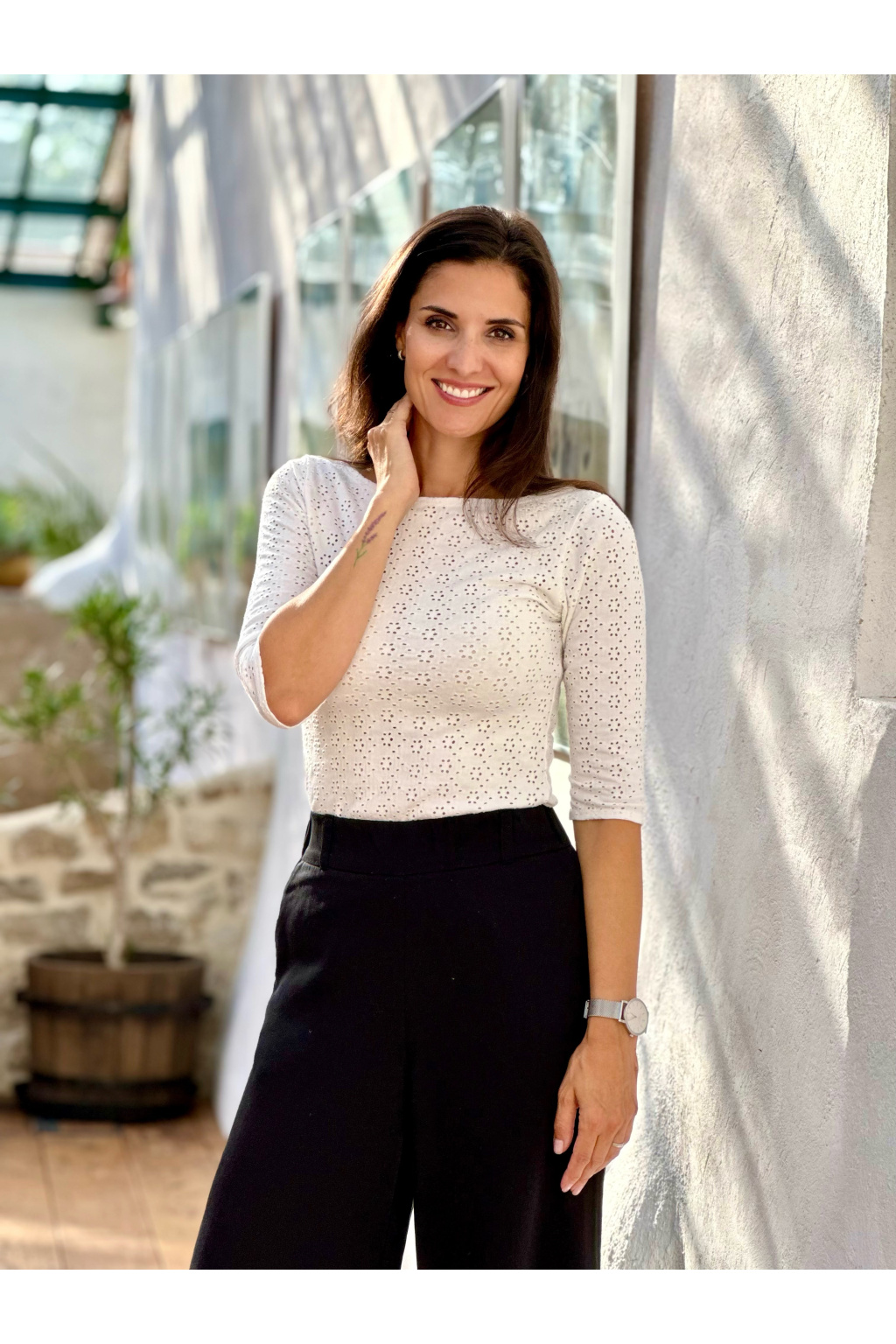 Modelka má na sobě: tričko vel. XS, lodičkový výstřih, 3/4 rukáv.